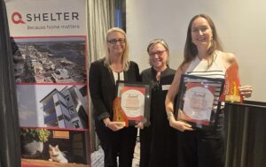 Joint winners of the 2025 Kent Maddock Memorial Award at the 2025 Q Shelter AGM: (L-R) Rebecca Fogarty: Director of Blackbird & Finch Estate Agents (Toowoomba Together Priority Housing), Fiona Caniglia: CEO of Q Shelter, and Victoria Parker: CEO of The Lady Musgrave Trust (Jinndii Waijung)